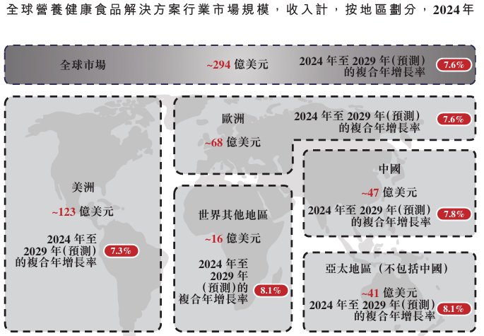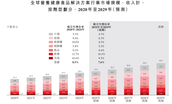 在消费升级进入新阶段以及产品研发与技术体系愈发复杂的新纪元背景下,营养健康食品行业正经历显著变化,品牌方面临的研发与制造需求日益精细化。由此,品牌方对专业营养健康食品解决方案提供商的依赖程度持续提升。根据灼识谘询的资料,全球营养健康食品解决方案市场的收入规模已由2020年的212亿美元增长至2024年的294亿美元,复合年增长率为8.5%;预计至2029年将进一步增长至424亿美元,2024年至2029年的复合年增长率为7.6%。