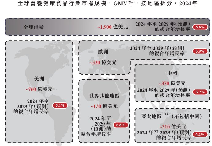 对长期管理的意识日益提升正重塑消费者行为模式,健康关注点正由以治疗为主的医疗服务向预防与日常健康管理延伸。该等因素奠定了全球营养健康食品行业持续长期的增长潜力。根据灼识咨询的资料,2024年全球营养健康食品GMV达1,900亿美元,预计到2029年将增至2,490亿美元,2024年至2029年的复合年增长率约为5.6%。展望未来,预计未来十年市场将维持约3%至5%的稳定增长。