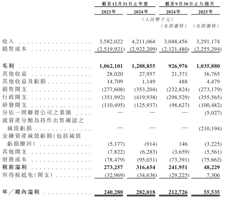 2023年、2024年及2025年截至9月30日止九个月,该公司年╱期内溢利分别约为2.40亿元、2.82亿元、5553.5万元人民币。