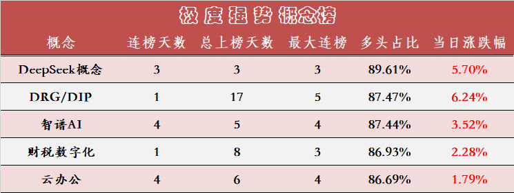 根据多空盯盘产品的统计,极度强势概念如上图所示。今日有增强势概念DRG/DIP和财税数字化,其中DRG/DIP概念早在前几日就在文中提醒大家多多关注(在多头占比上升最大的概念榜中),DeepSeek概念、智谱AI及云办公依然热度不减,蝉联在榜!