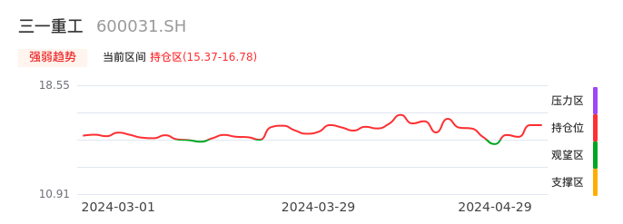 我们来看一下该股的九方特色指标强弱趋势的情况:三一重工自04月24日从观望区上穿到持仓区。股价近期在多头区域持续强势上扬,上升动能仍较为充足,可积极关注。后续重点关注上方压力位:16.78元是否能突破上攻。