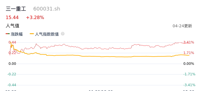 04月24日,三一重工收报15.44,股价涨幅3.28%,成交金额11.03亿元,换手率0.85%。