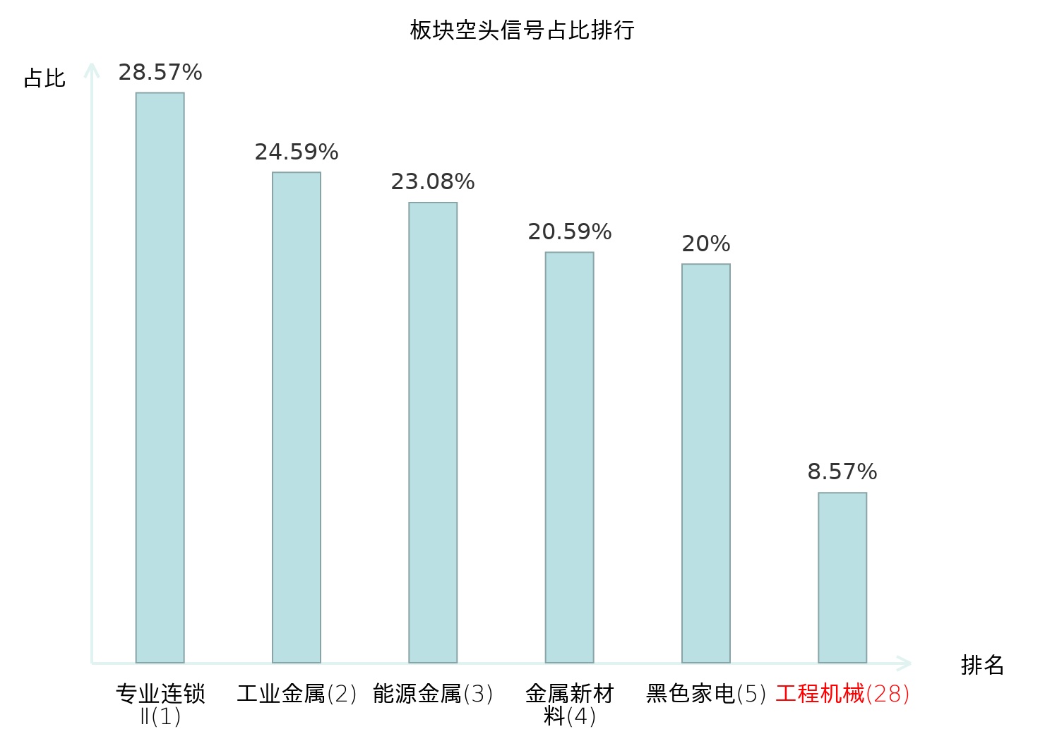 全市场所有行业板块中主力空头信号占比排名中,专业连锁Ⅱ板块位居第一。装修建材板块名次提升最快,较昨日上升120位。