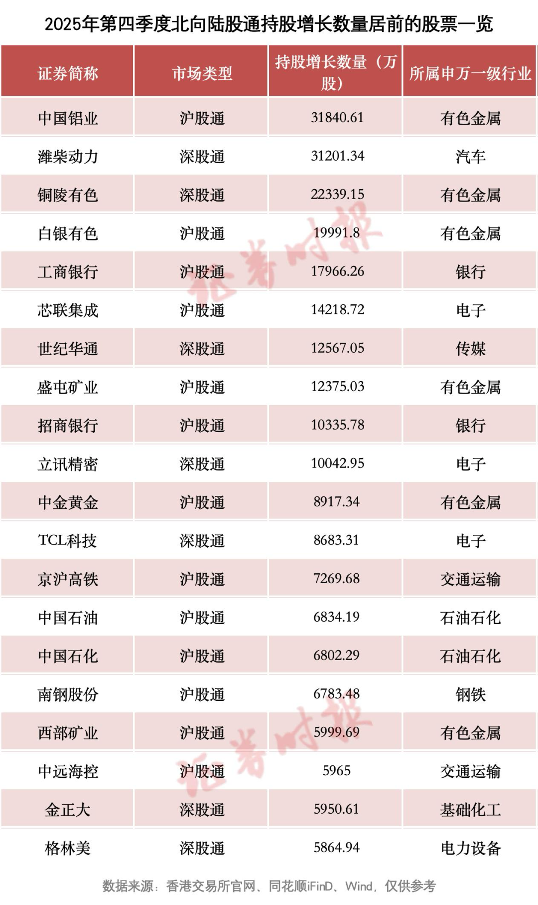 根据香港交易所网站披露的资料,北向陆股通(含沪股通和深股通,下同)2025年第四季度末的持股数据正式披露,北向陆股通资金在2025年第四季度的持股动向也初步浮出水面。