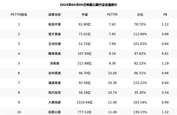 从估值角度看:福建高速最新市盈率PETTM为10.36,在行业内排名7/34,处于115.22分位。