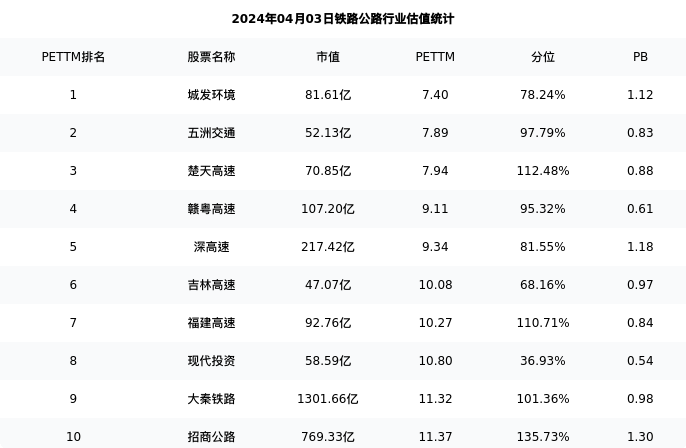 从估值角度看:福建高速最新市盈率PETTM为10.27,在行业内排名7/34,处于110.71分位。