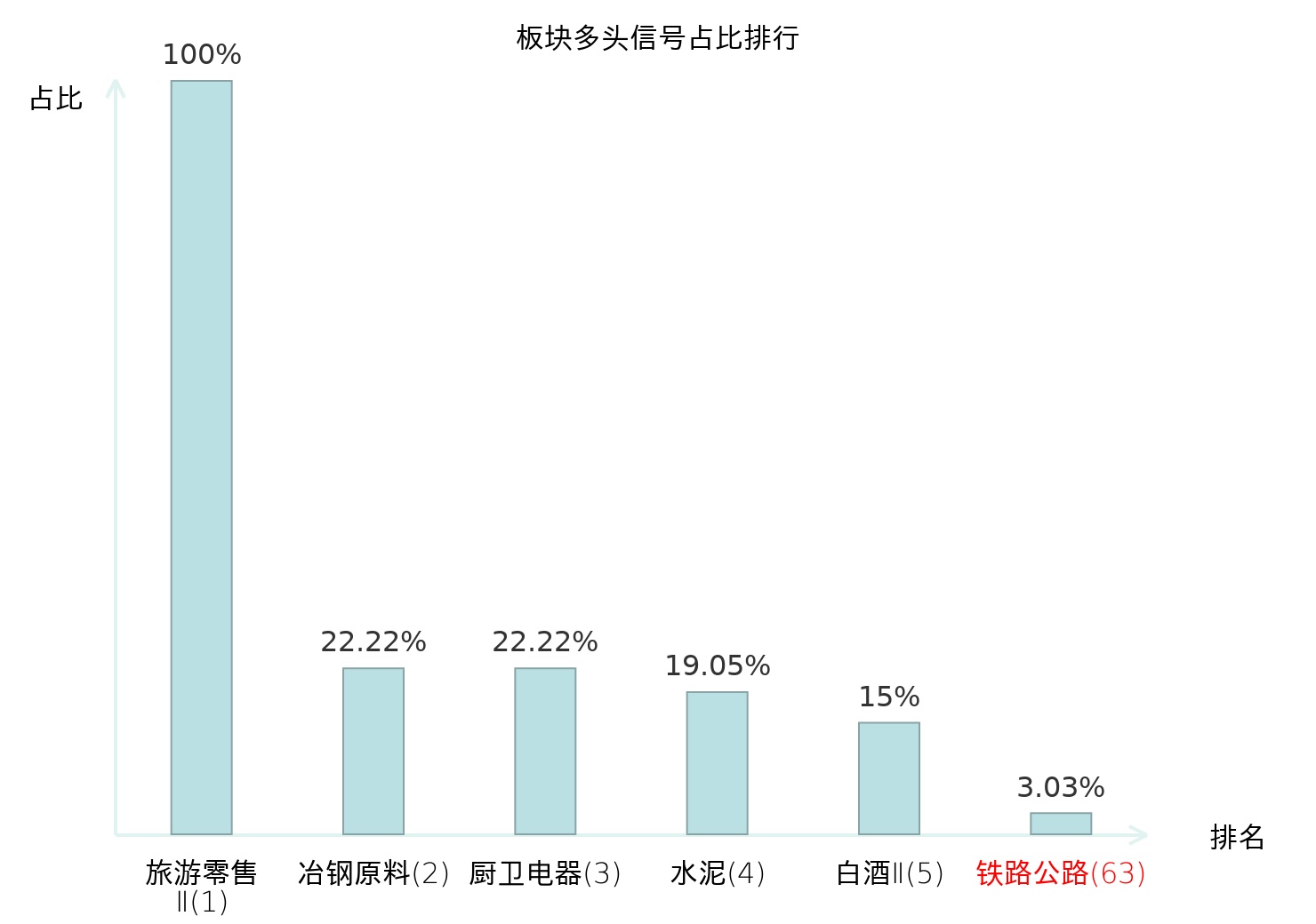 全市场所有行业板块中主力多头信号占比排名中,旅游零售Ⅱ板块位居第一。旅游零售Ⅱ板块名次提升最快,较昨日上升130位。
