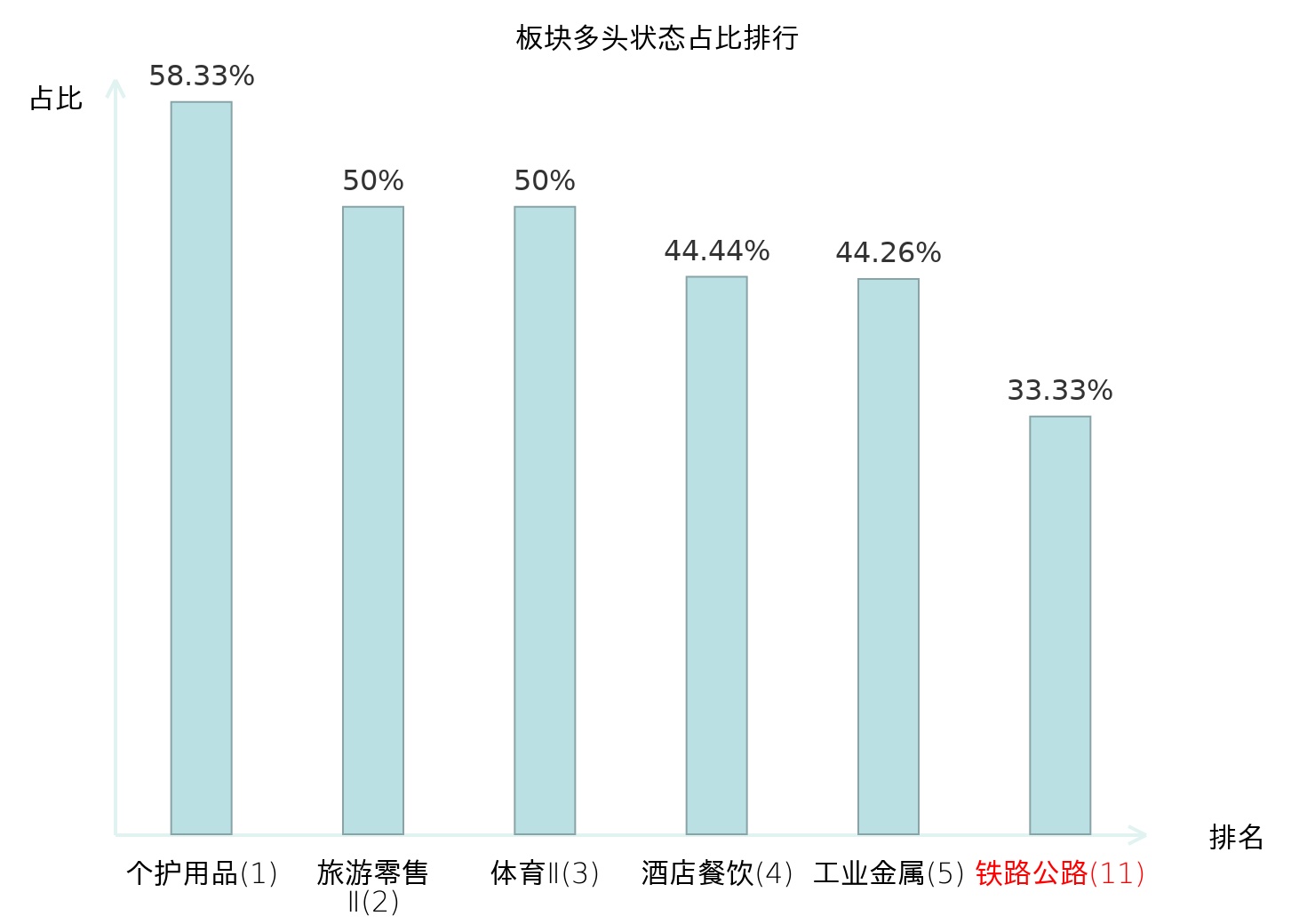 全市场所有行业板块中主力多头状态占比排名中,个护用品板块位居第一。非白酒板块名次提升最快,较昨日上升65位。