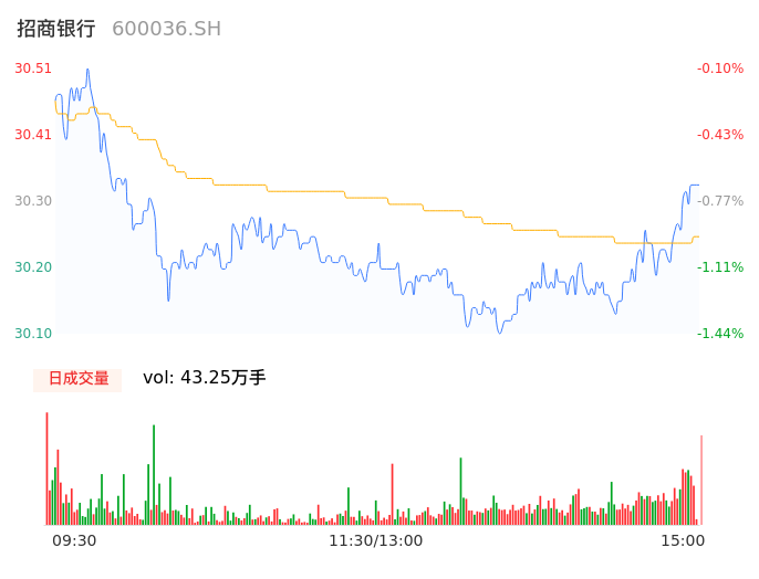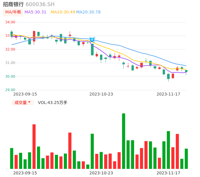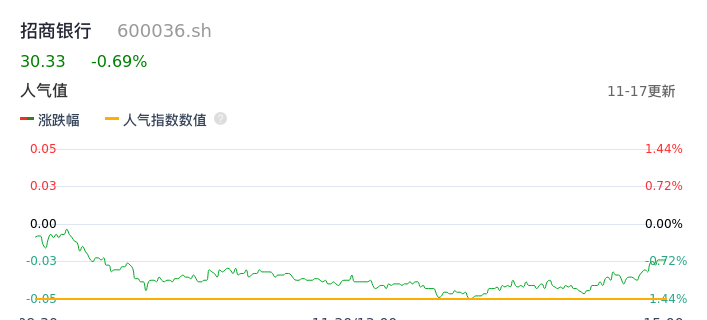 11月17日,招商银行收报30.33,股价涨幅-0.69%,成交金额13.08亿元,换手率0.21%。