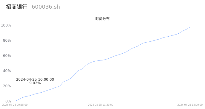 600036招商银行2024年04月25日成交91.95万手,成交金额31.37亿元,相较昨日放量47.61万手,换手率0.45%,成交清淡。