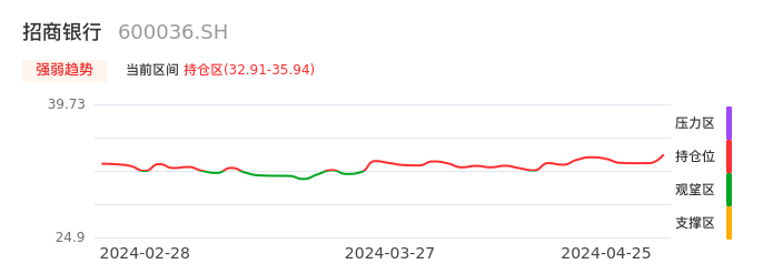 我们来看一下该股的九方特色指标强弱趋势的情况:招商银行自03月26日从观望区上穿到持仓区。股价近期在多头区域持续强势上扬,上升动能仍较为充足,可积极关注。后续重点关注上方压力位:35.94元是否能突破上攻。