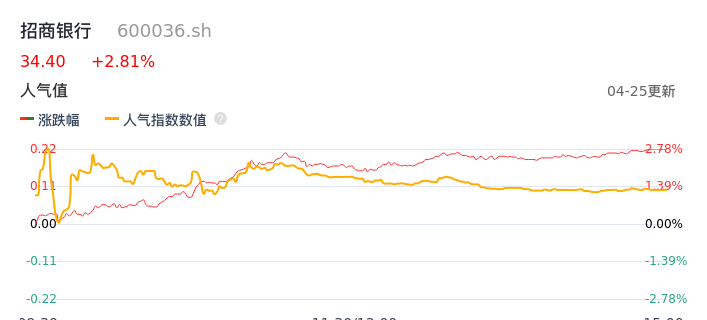 04月25日,招商银行收报34.40,股价涨幅2.81%,成交金额31.37亿元,换手率0.45%。