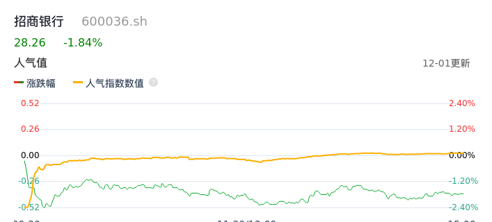 12月01日,招商银行收报28.26,股价涨幅-1.84%,成交金额24.97亿元,换手率0.43%。