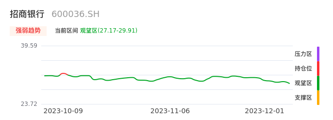 我们来看一下该股的九方特色指标强弱趋势的情况:招商银行自10月13日从持仓区下穿到观望区,股价近期持续走弱。短期已经进入空头行情,且下跌动能仍未衰竭。建议继续谨慎观望。