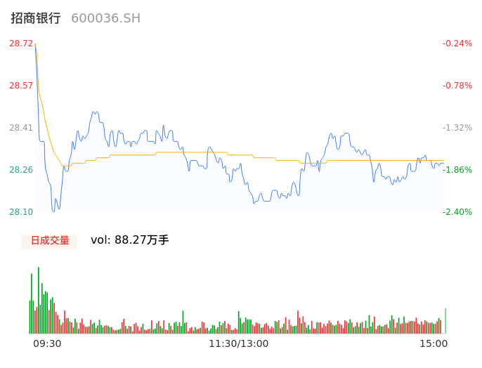 12月01日,招商银行收报28.26,股价涨幅-1.84%,成交金额24.97亿元,换手率0.43%。
