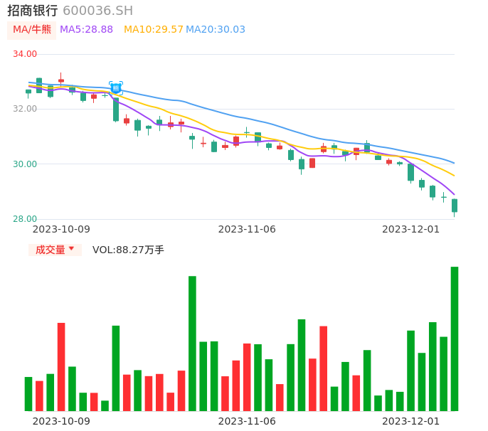 12月01日,招商银行收报28.26,股价涨幅-1.84%,成交金额24.97亿元,换手率0.43%。
