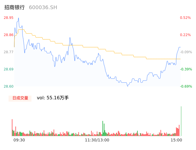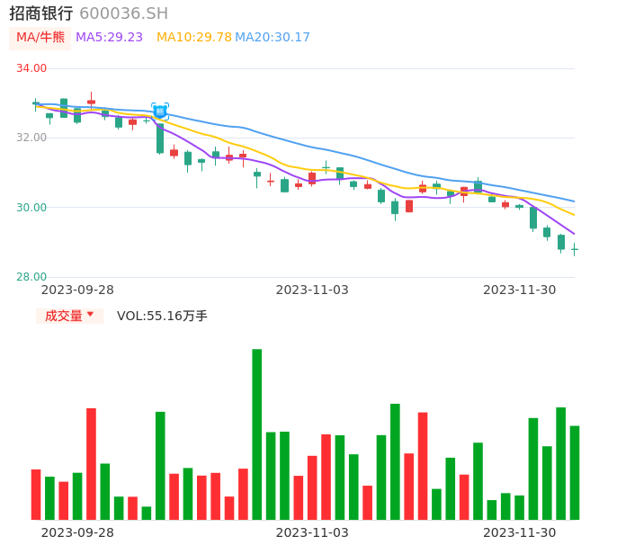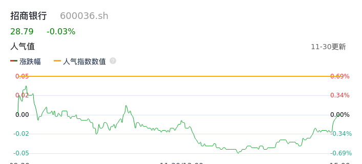 11月30日,招商银行收报28.79,股价涨幅-0.03%,成交金额15.85亿元,换手率0.27%。