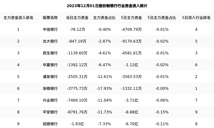 招商银行今日净流出1.83亿元,主力占比7.33%,在行业内排名:9/9;5日净流出6.70亿元,主力占比0.11%,在行业内排名:8/9。