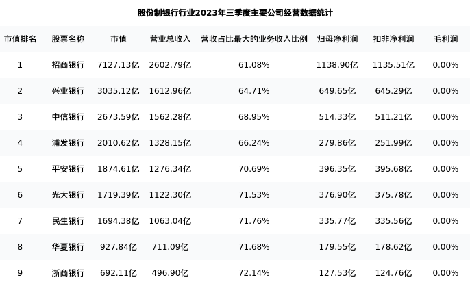 招商银行最新报告期数据为三季度,下表汇总了股份制银行行业内市值靠前的公司三季度主要经营数据
