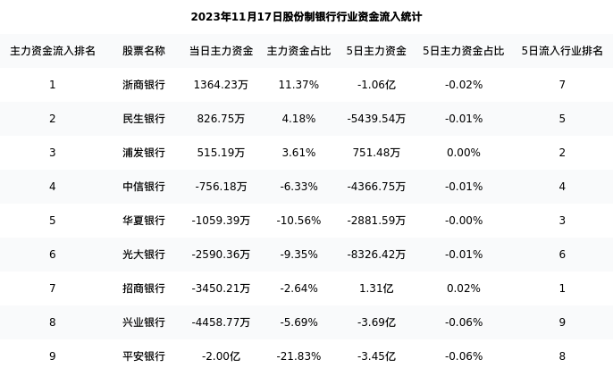 招商银行今日净流出3450.21万元,主力占比2.64%,在行业内排名:7/9;5日净流入1.31亿元,主力占比0.02%,在行业内排名:1/9。