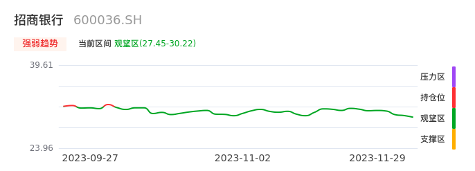 我们来看一下该股的九方特色指标强弱趋势的情况:招商银行自10月13日从持仓区下穿到观望区,股价近期持续走弱。短期已经进入空头行情,且下跌动能仍未衰竭。建议继续谨慎观望。