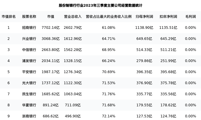 招商银行最新报告期数据为三季度,下表汇总了股份制银行行业内市值靠前的公司三季度主要经营数据