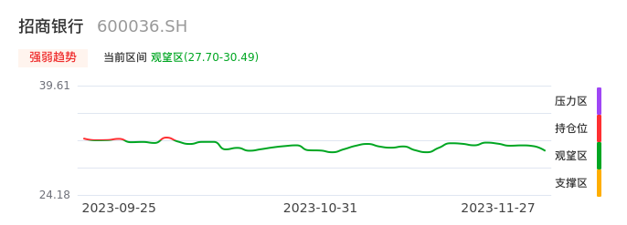 我们来看一下该股的九方特色指标强弱趋势的情况:招商银行自10月13日从持仓区下穿到观望区,股价近期持续走弱。短期已经进入空头行情,且下跌动能仍未衰竭。建议继续谨慎观望。