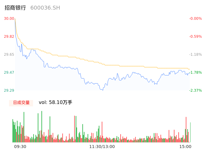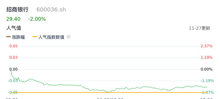 11月27日,招商银行收报29.40,股价涨幅-2.00%,成交金额17.14亿元,换手率0.28%。