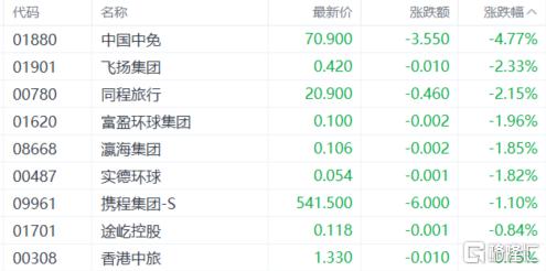 旅游及观光板块走低,中国中免跌近5%,同程旅行、携程集团、香港中旅等下跌。