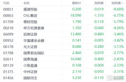 证券板块低迷,招商证券、光大证券跌超3%,国泰君安国际、国泰海通、中州证券等跟跌。