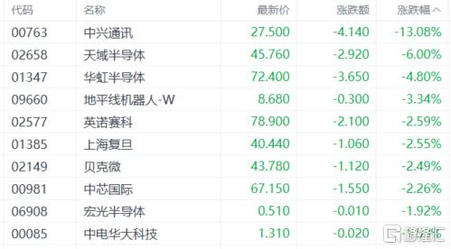 半导体、芯片股下挫,中兴通讯跌超13%,天域半导体、华虹半导体、地平线机器人、英诺赛科、上海复旦、贝克微等跟跌。