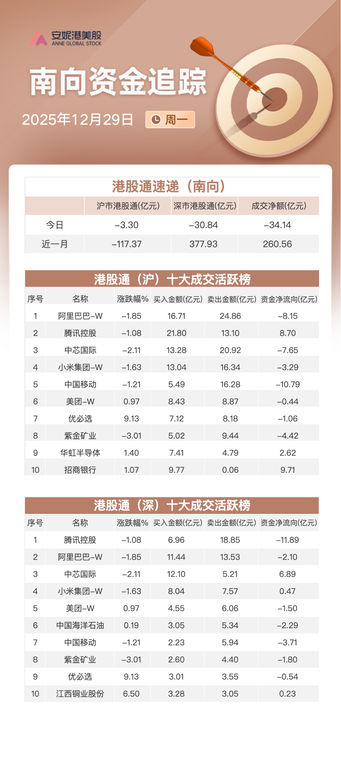 但港股今日震荡收跌,南向资金也净卖出约34.14亿港元。其中,沪港股通净流出约3.30亿港元,深港股通净流出约30.84亿港元。