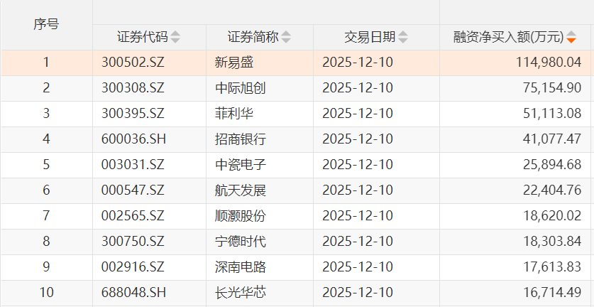 个股方面,31股获融资净买入额超1亿元。新易盛获融资净买入额居首,净买入11.50亿元;融资净买入金额居前的还有中际旭创、菲利华、招商银行、中瓷电子、航天发展、顺灏股份、宁德时代、深南电路、长光华芯等。