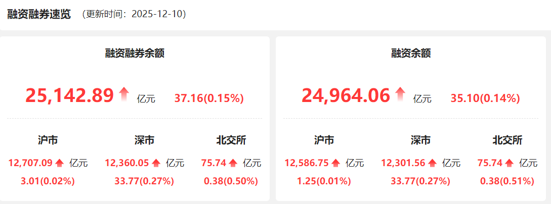 上证报中国证券网讯12月10日,A股两融余额为25142.89亿元,较上一交易日增加37.16亿元,占A股流通市值比例为2.60%。当日两融交易额为1812.93亿元,较上一交易日减少218.27亿元,占A股成交额的10.11%。