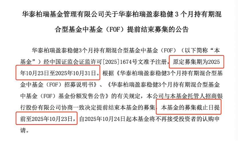 10月23日下午,华泰柏瑞基金公告称,当日发行的华泰柏瑞盈泰稳健3个月持有混合FOF公告提前结募。