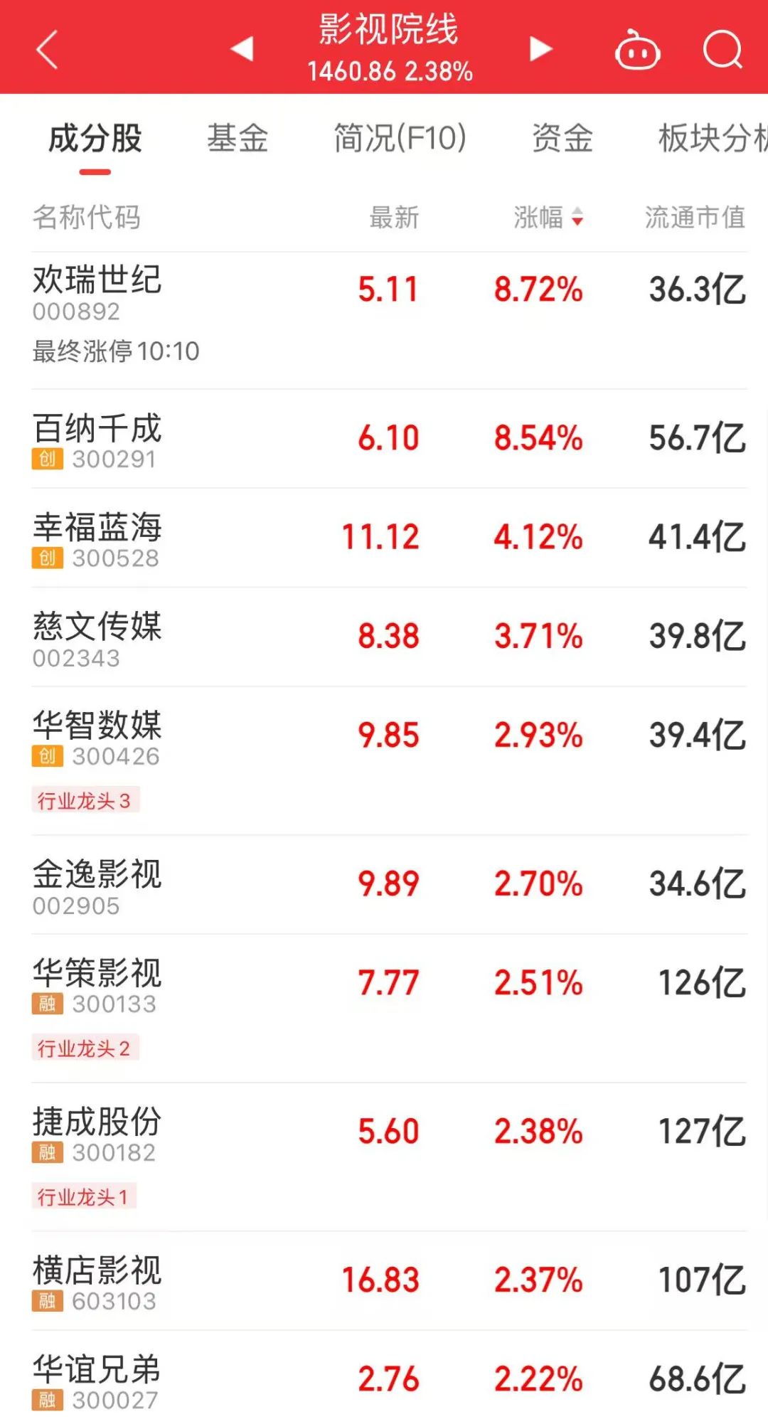 今天上午,传媒股表现活跃,影视院线、短剧游戏等板块上涨。欢瑞世纪、百纳千成涨超8%。