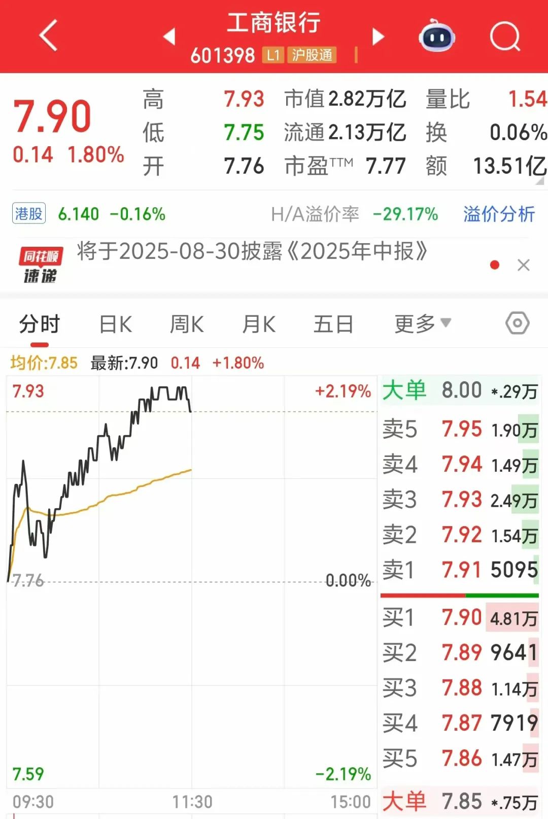 今日上午,银行股大涨。工商银行上涨1.8%,股价创历史新高,最新总市值为2.82万亿元,稳居A股第一。农业银行、邮储银行、中信银行等个股,盘中股价也创历史新高。