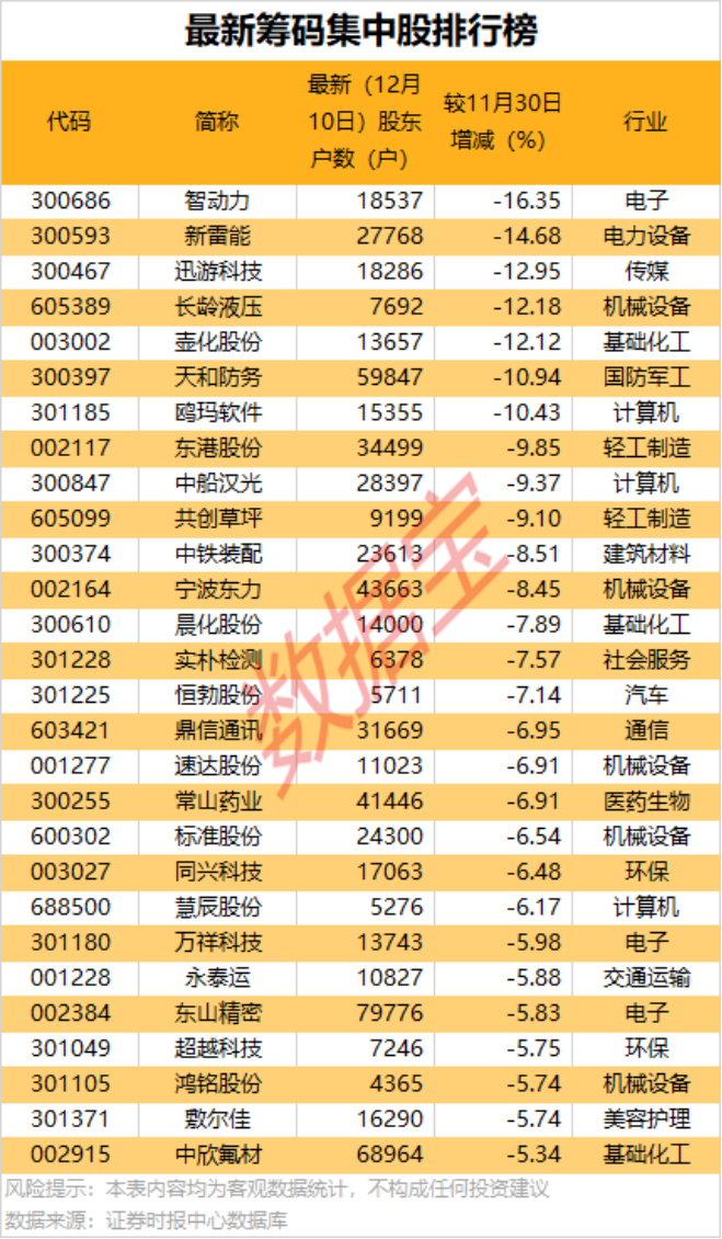 股东户数降幅最多的是智动力,截至12月10日最新股东户数为18537户,较11月30日下降16.35%;其次是新雷能,最新股东户数为27768户,较11月30日下降14.68%,股东户数降幅居前的还有迅游科技、长岭液压、壶化股份等。