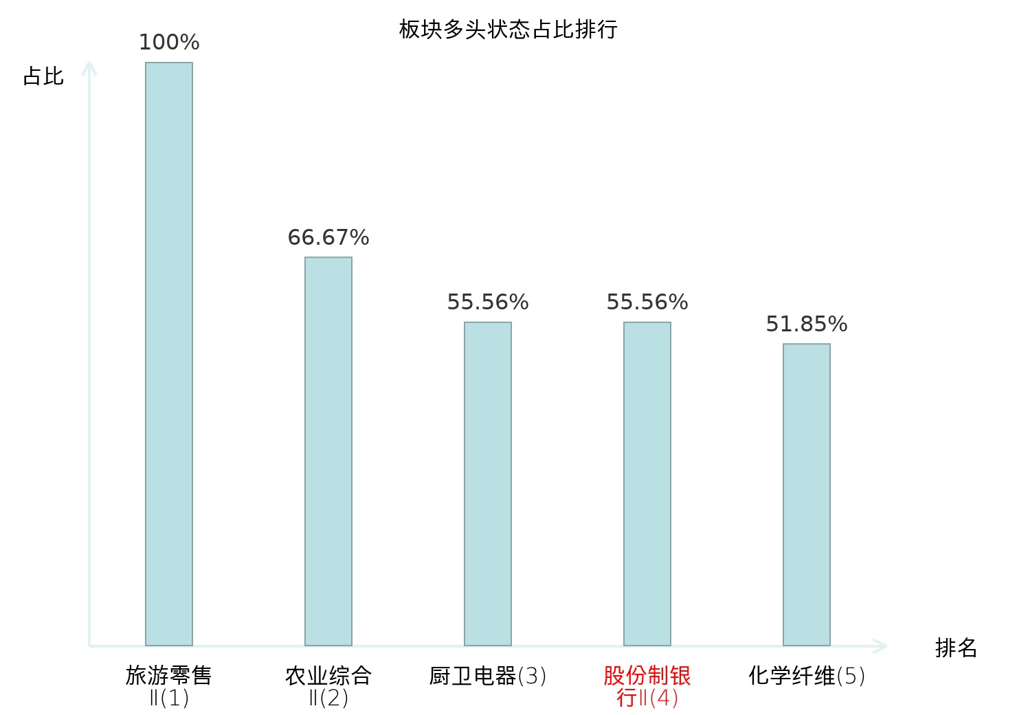 全市场所有行业板块中主力多头状态占比排名中,旅游零售Ⅱ板块位居第一。国有大型银行Ⅱ板块名次提升最快,较昨日上升103位。