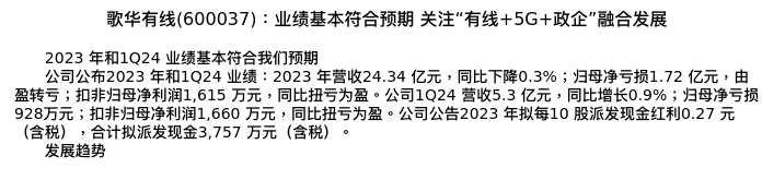 值得注意的是:2024年04月中金公司的张雪晴/焦杉分析师,首次发布关于歌华有线的研究报告,标题为:歌华有线(600037):业绩基本符合预期 关注“有线+5G+政企”融合发展。