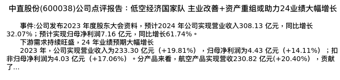 值得注意的是:2024年04月方正证券的李鲁靖/刘明洋分析师,首次发布关于中直股份的研究报告,标题为:中直股份(600038)公司点评报告:低空经济国家队 主业改善+资产重组或助力24业绩大幅增长。