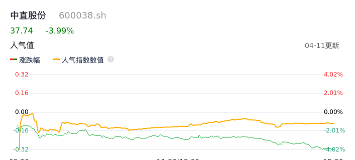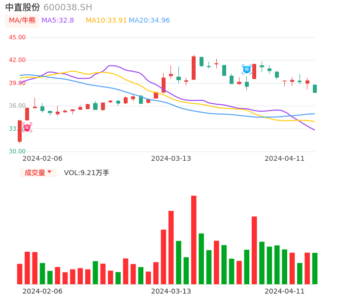 04月11日,中直股份收报37.74,股价涨幅-3.99%,成交金额3.52亿元,换手率1.56%。