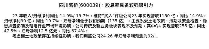 值得注意的是:2024年04月华泰证券的方晏荷/黄颖分析师,首次发布关于四川路桥的研究报告,标题为:四川路桥(600039):股息率具备较强吸引力。