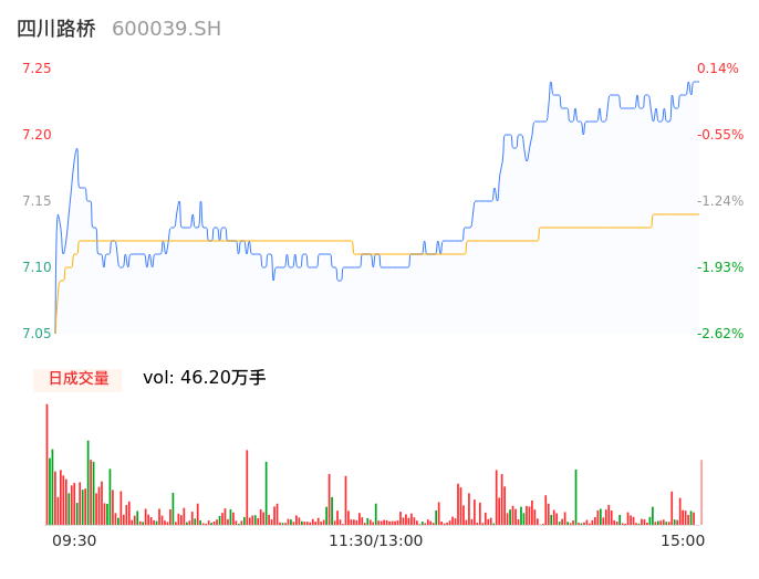 04月30日,四川路桥收报7.25,股价涨幅0.14%,成交金额3.30亿元,换手率0.69%。