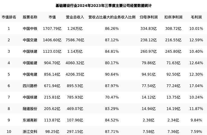 四川路桥最新报告期数据为2023年三季度,下表汇总了基础建设行业内市值靠前的公司2023年三季度主要经营数据