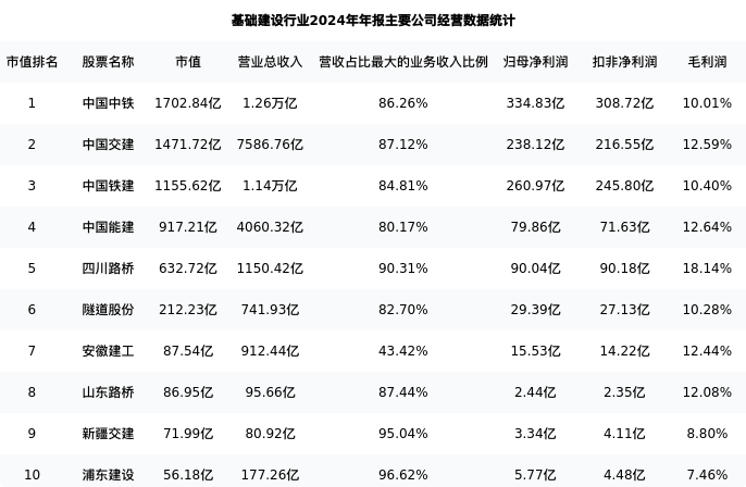 四川路桥最新报告期数据为年报,下表汇总了基础建设行业内市值靠前的公司年报主要经营数据