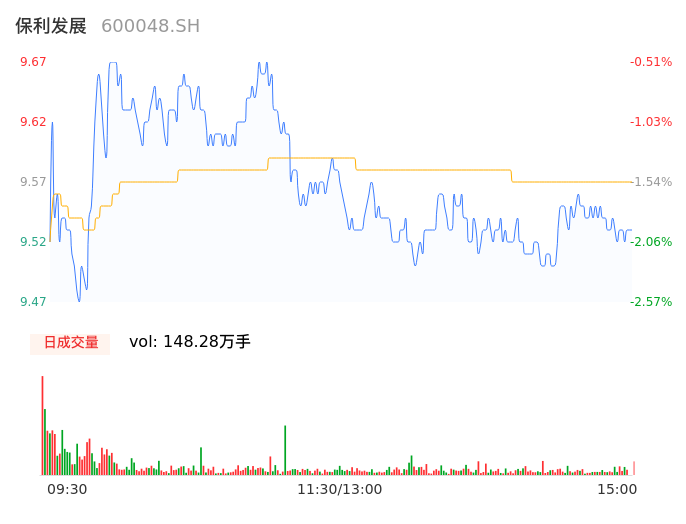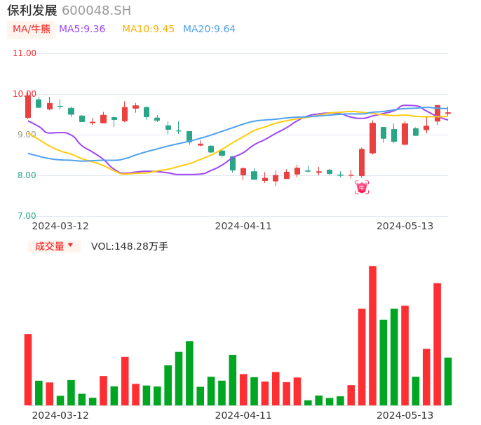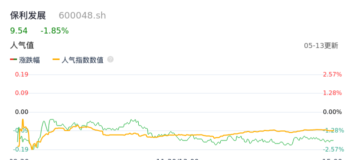 05月13日,保利发展收报9.54,股价涨幅-1.85%,成交金额14.19亿元,换手率1.24%。