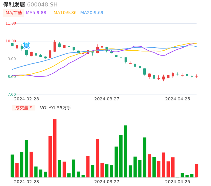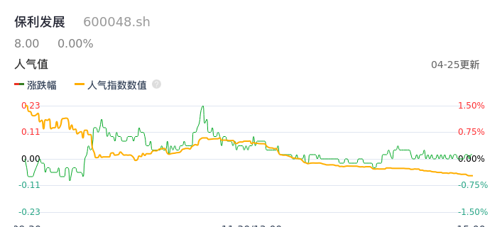 04月25日,保利发展收报8.00,股价涨幅0.00%,成交金额7.35亿元,换手率0.76%。