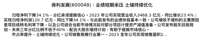 值得注意的是:2024年04月国信证券的任鹤/王粤雷/王静分析师,首次发布关于保利发展的研究报告,标题为:保利发展(600048):业绩短期承压 土储持续优化。