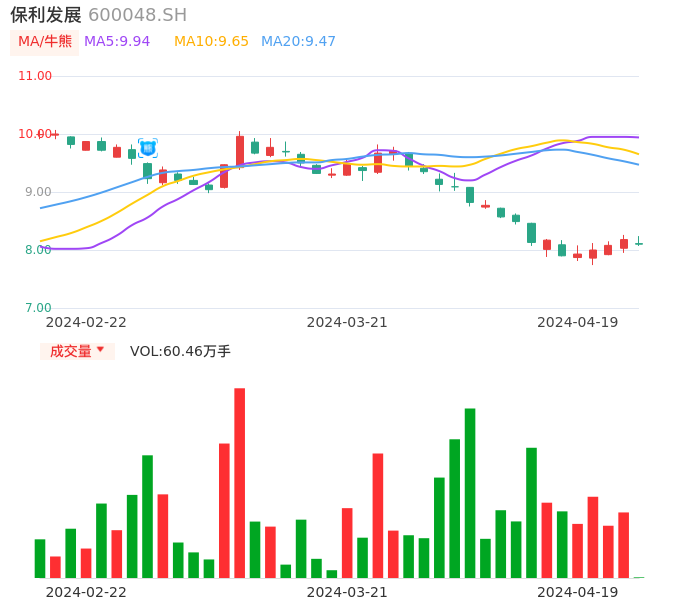 04月19日,保利发展收报8.10,股价涨幅-0.98%,成交金额4.92亿元,换手率0.51%。